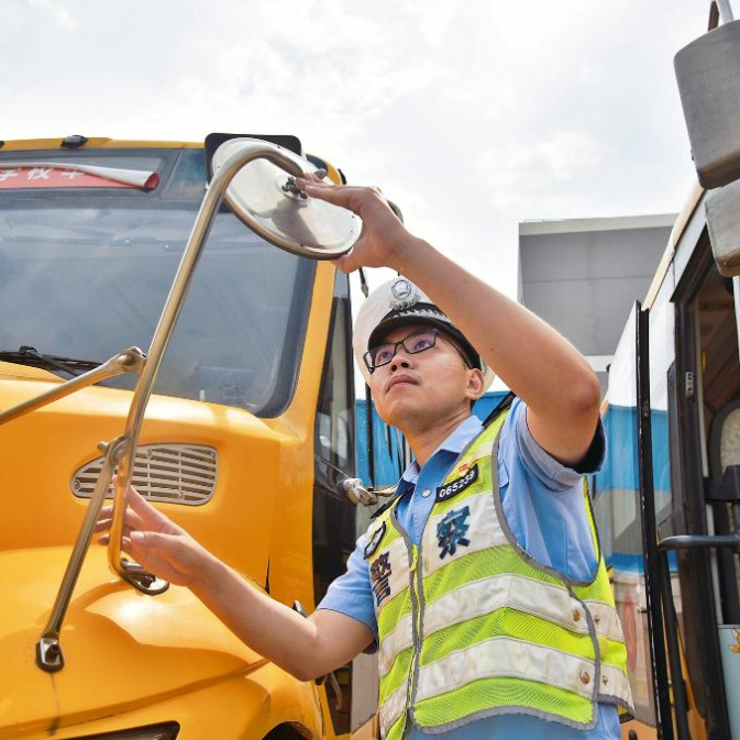 8月27日,江苏省如皋市公安局交通警察大队经济技术开发区交警中队的民警在检查校车倒车镜。