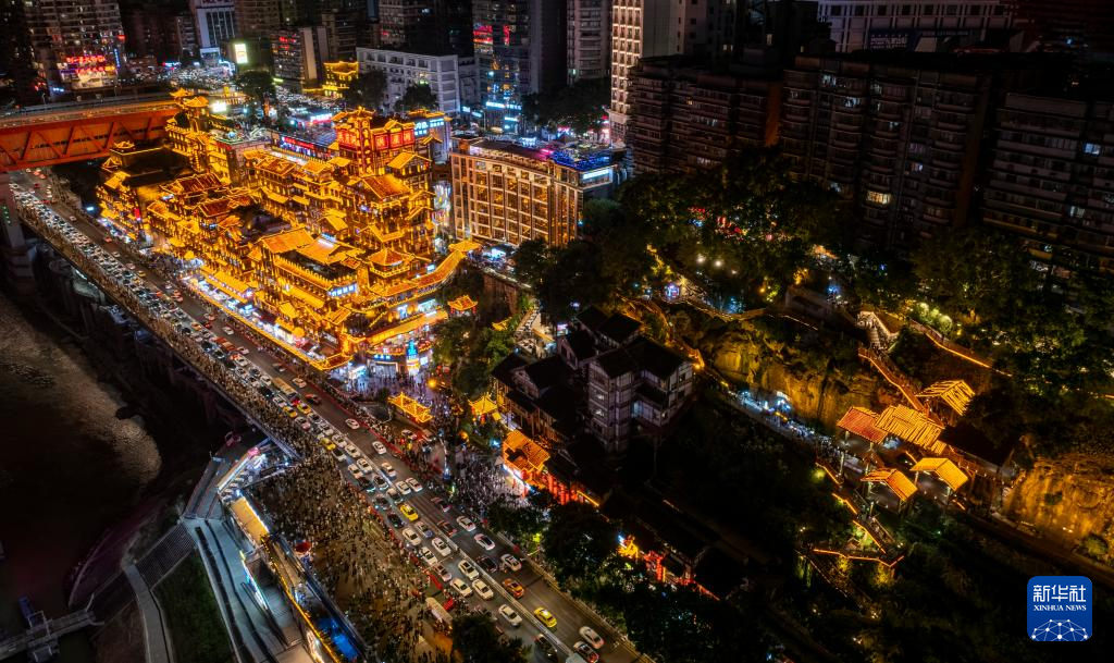 8月23日拍摄的重庆渝中区戴家巷(右侧)、洪崖洞(左侧)城市夜景(无人机照片)。