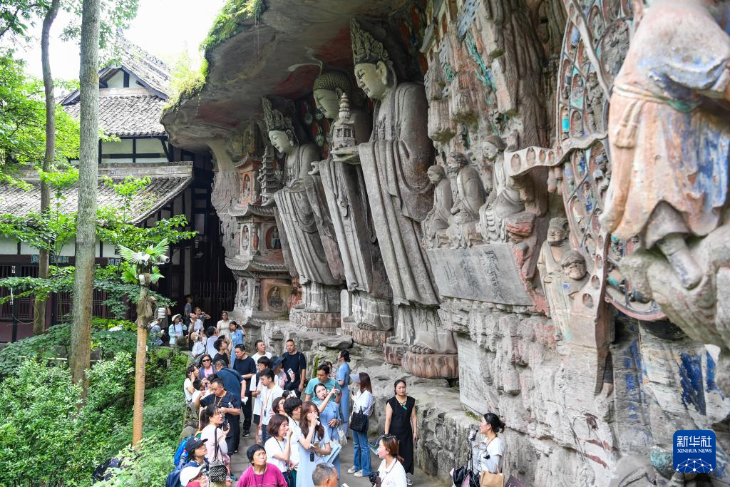 游客在重庆大足石刻景区游览(7月7日摄)。
