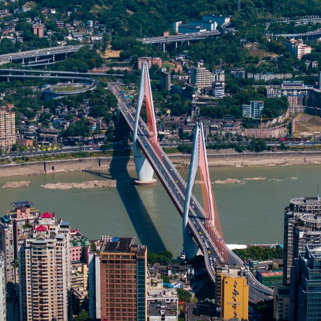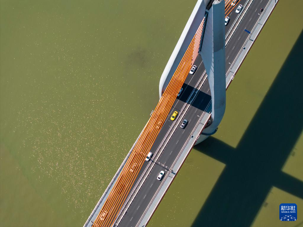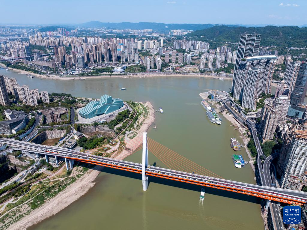 8月23日,车辆在跨越嘉陵江的重庆中心城区千厮门嘉陵江大桥上穿行(无人机照片)。