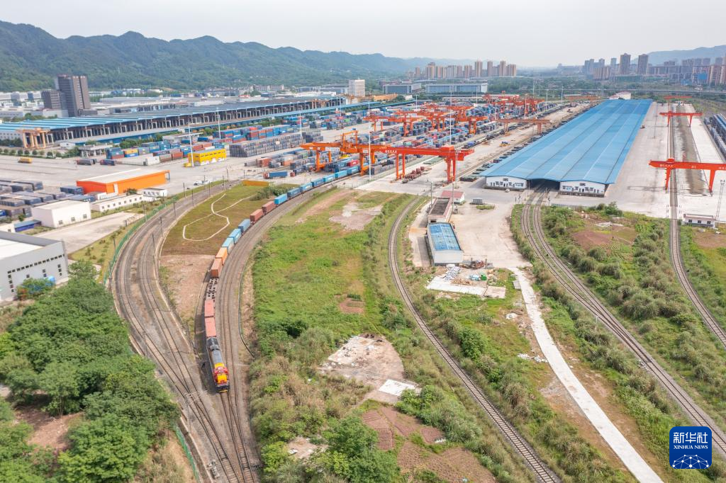 在重庆国际物流枢纽园区,一列装载机械设备、汽车和笔记本电脑的西部陆海新通道班列从重庆团结村中心站驶出(5月5日摄,无人机照片)。