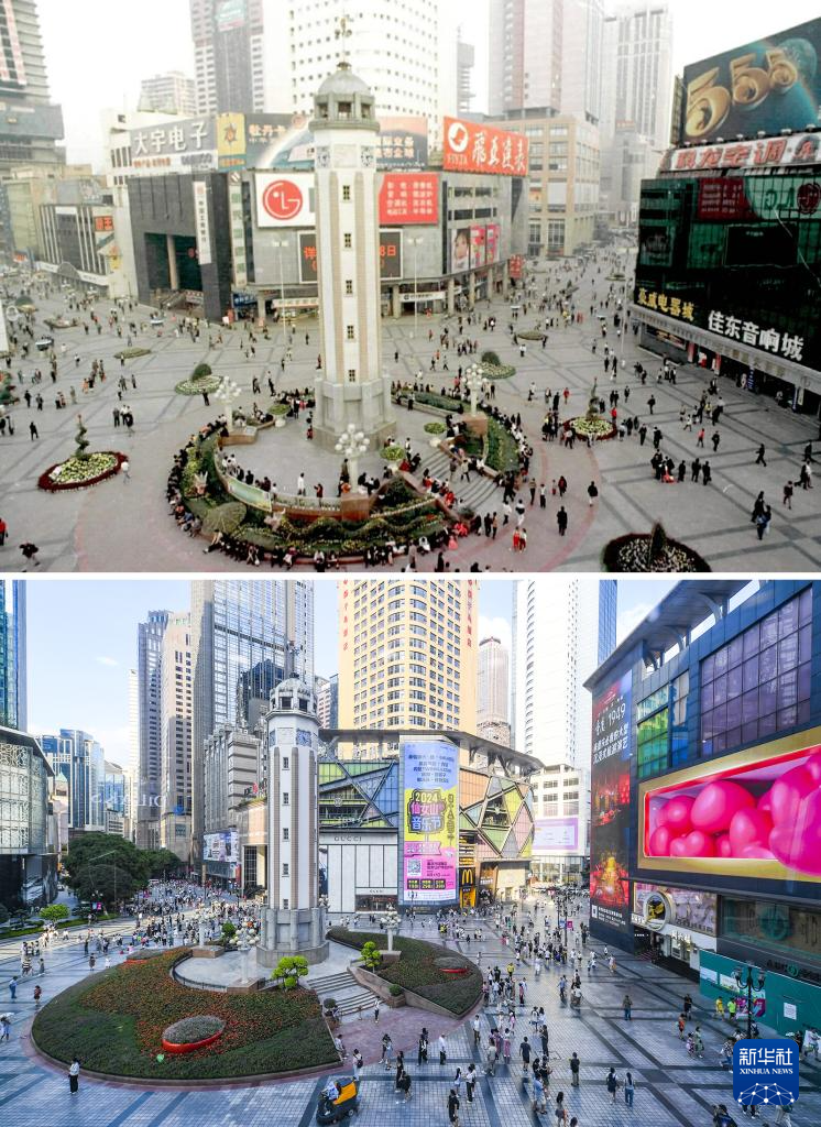 拼版照片:上图为重庆市渝中区解放碑一带景象(资料照片,新华社记者杨磊摄);下图为2024年8月21日拍摄的重庆市渝中区解放碑一带景象(新华社记者王全超摄)。
