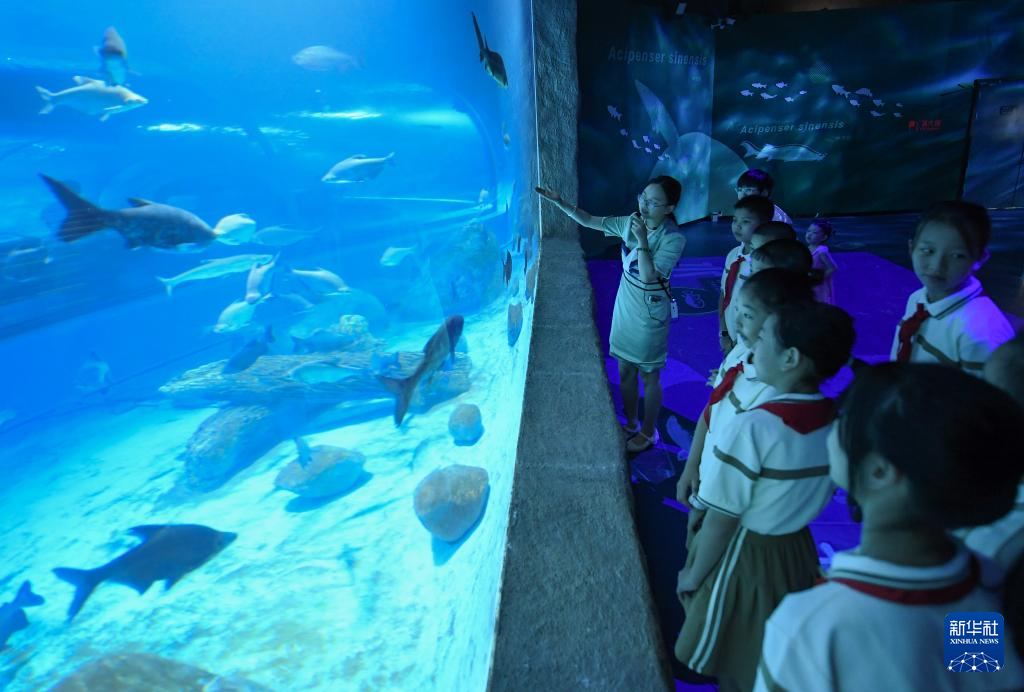 8月27日,家长带着孩子在浙东淡水鱼馆参观。