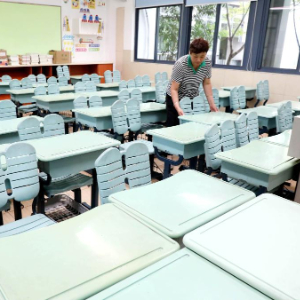 8月27日,在江苏省苏州市金阊实验小学校,教职工在整理教室桌椅。