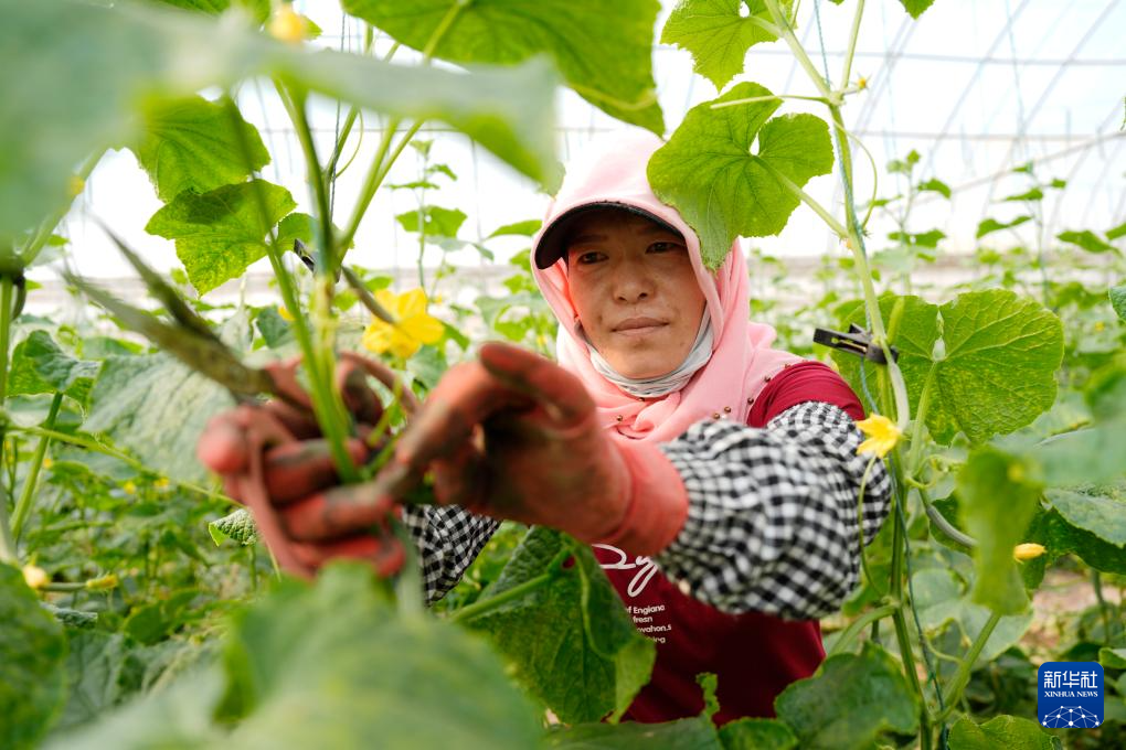 宁夏固原市原州区彭堡镇姚磨村瑞丰蔬菜产销合作社农户在温棚内采摘黄瓜(8月24日摄)。