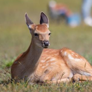 8月27日,在黑龙江伊春市上甘岭溪水国家森林公园鹿溪牧场,一只鹿在草坪上休息。