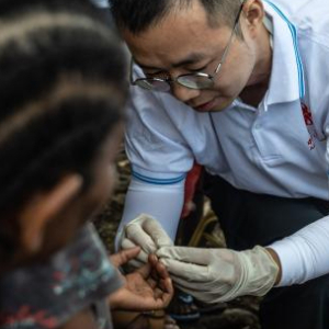 8月27日,中国抗疟团队组员周晟在位于科摩罗首都莫罗尼北部的村庄内为村民采血化验。