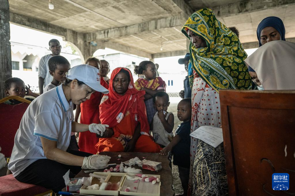 8月27日,中国抗疟团队组长陈银环(右二)在位于科摩罗首都莫罗尼北部的村庄内为村民采血化验。