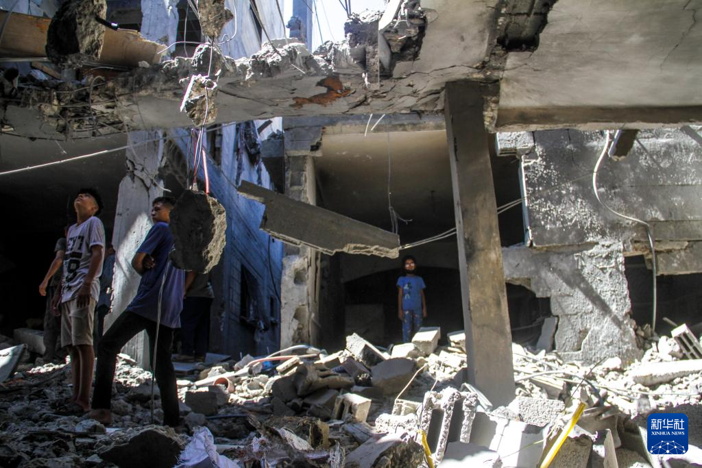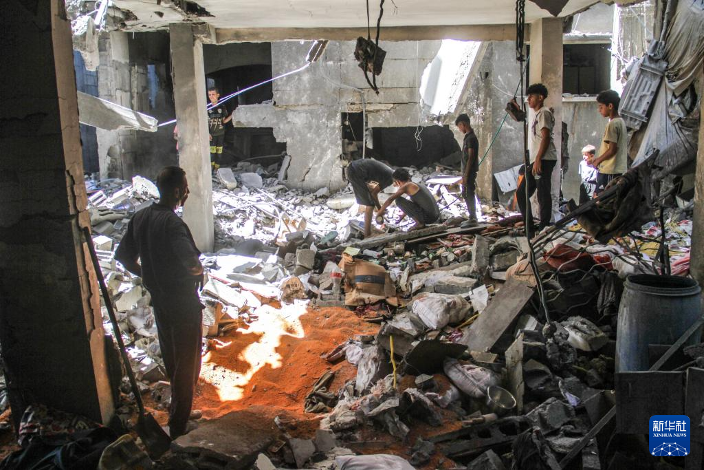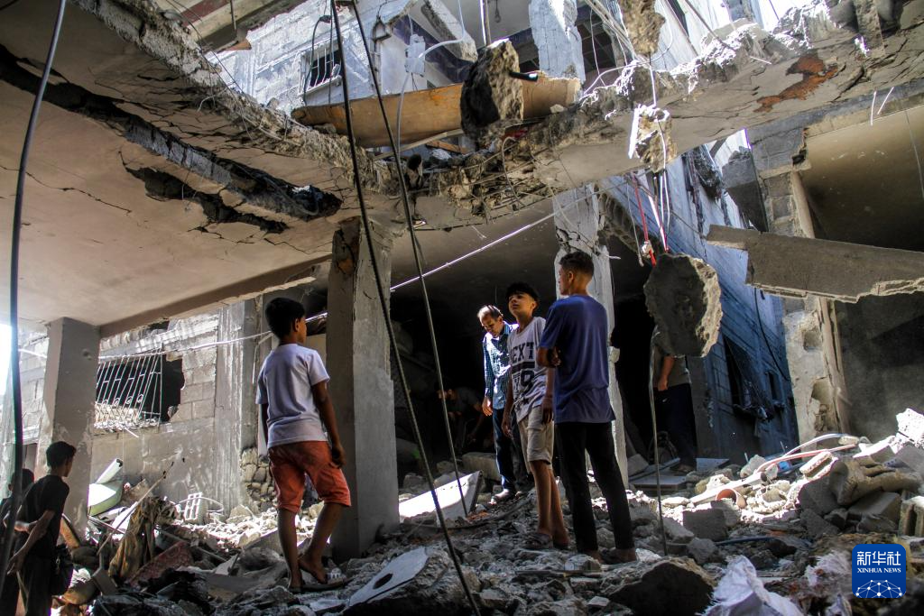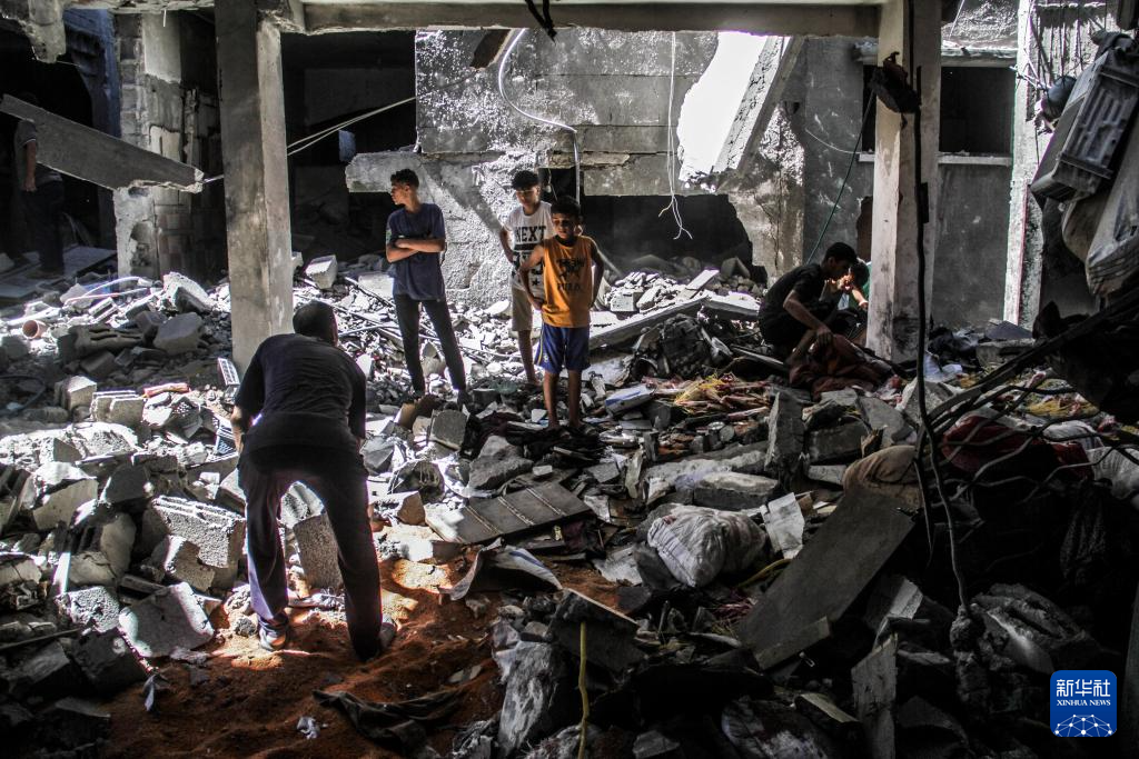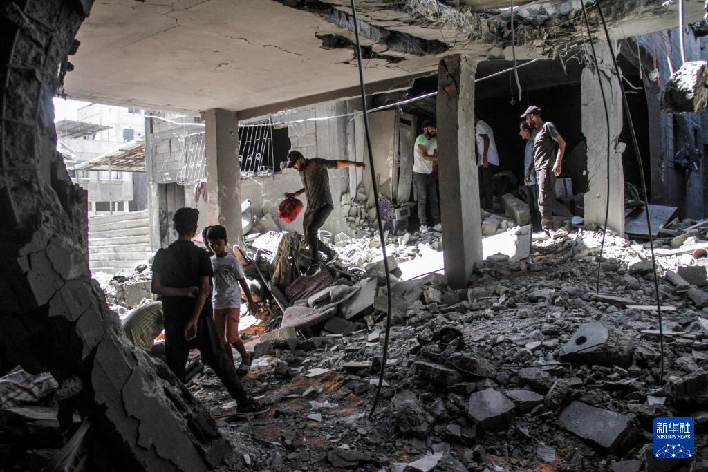 8月28日,在加沙地带北部的杰巴利耶难民营,人们查看遭以军轰炸后的建筑废墟。