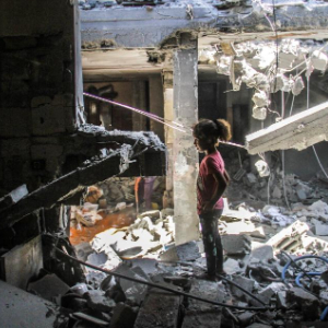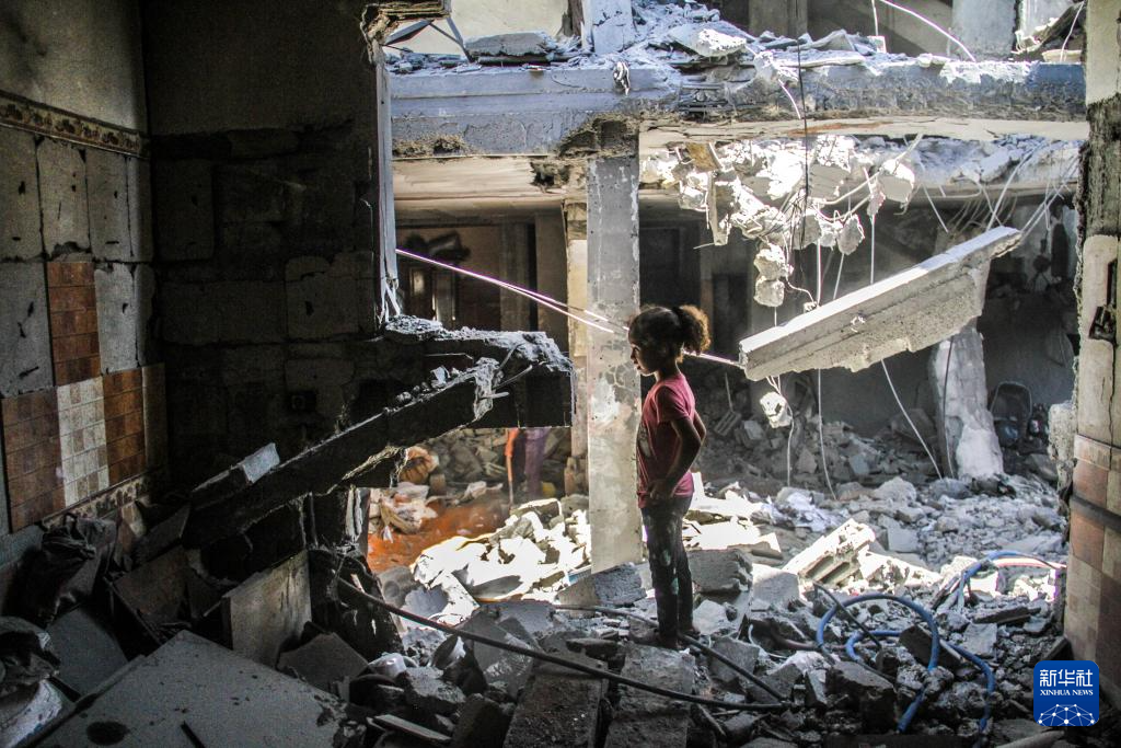 8月28日,在加沙地带北部的杰巴利耶难民营,一名女孩站在遭以军轰炸后的建筑废墟里。