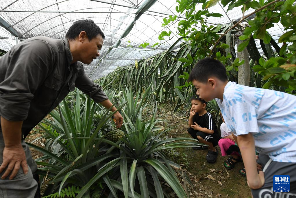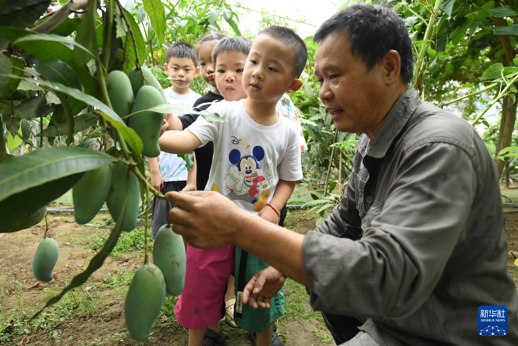 8月28日,在诸暨市浬浦镇,返乡创业的种植户姚雪锋在热带水果园内给参加研学的小学生介绍水果知识。