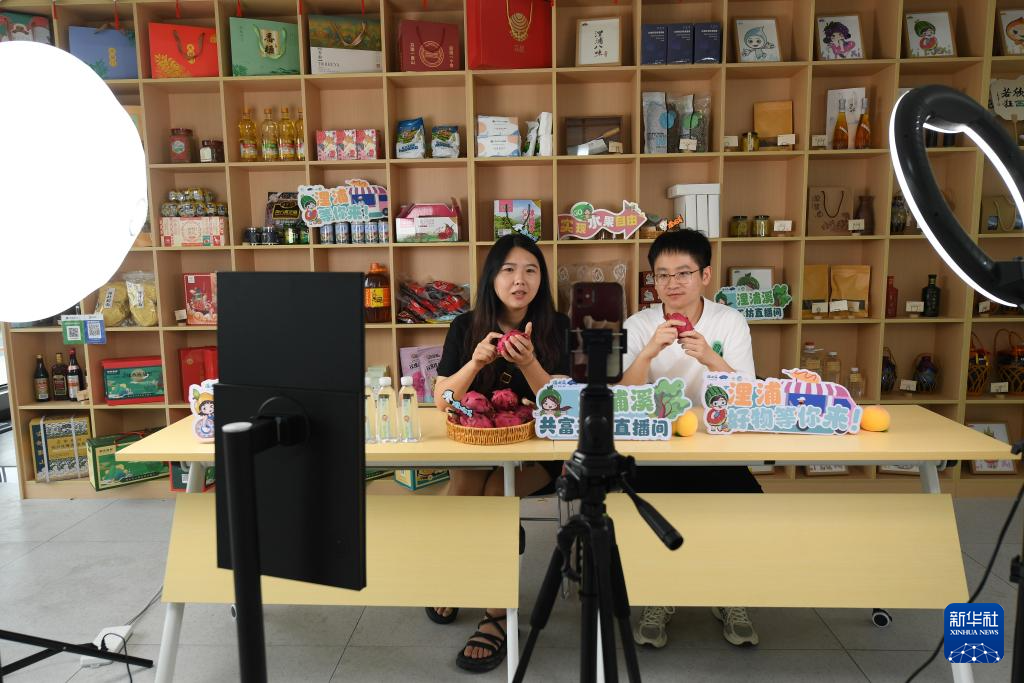 8月28日,在诸暨市浬浦镇共富工坊,乡镇干部和年轻果农在直播卖果。