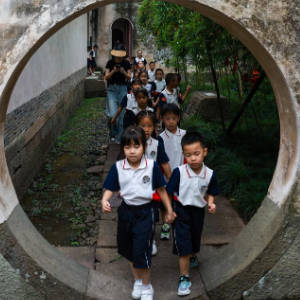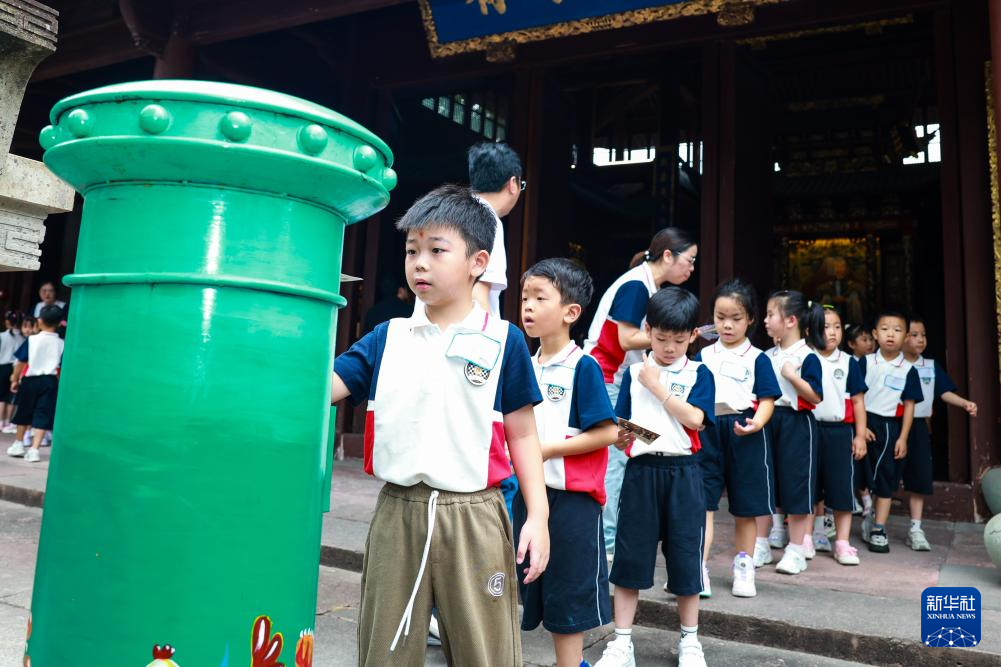 8月28日,宁波市中城小学一年级新生在开学礼结束后参观孔庙。