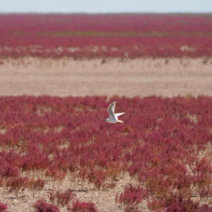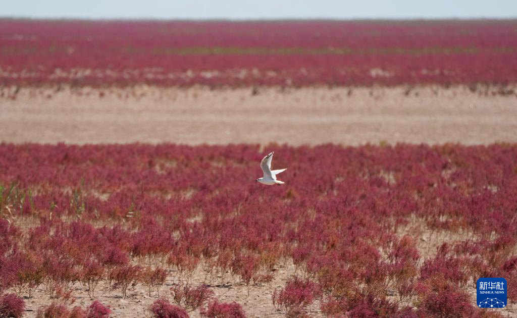 8月28日,黄河三角洲国家级自然保护区的滩涂上生长的碱蓬草如同红色的地毯。