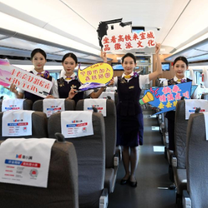 8月29日,列车乘务员在宣绩高铁试运行列车上欢迎乘客。