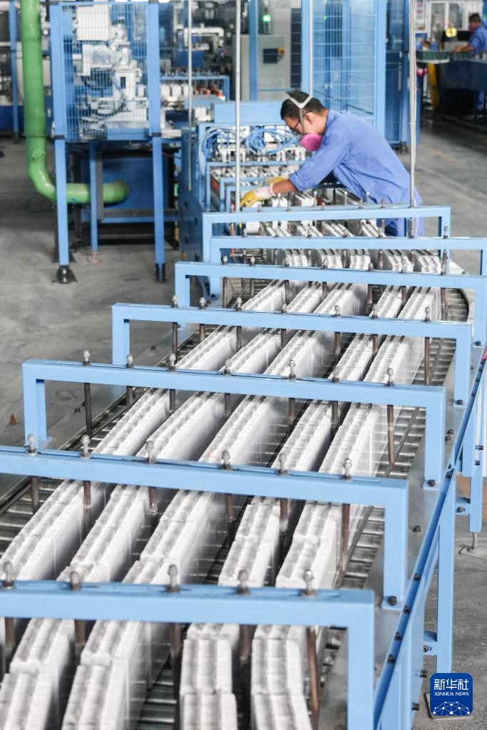 8月27日,宁阳县山东超威电源有限公司职工在生产蓄电池。