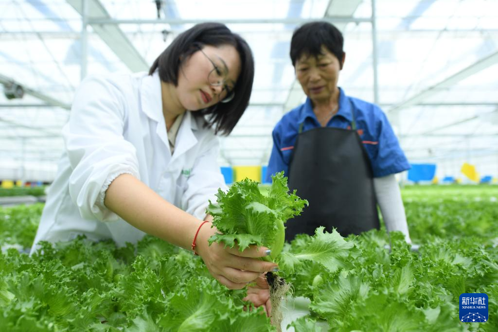 8月29日,技术人员在“红芯植物工厂”检查无土栽培生菜的根系。