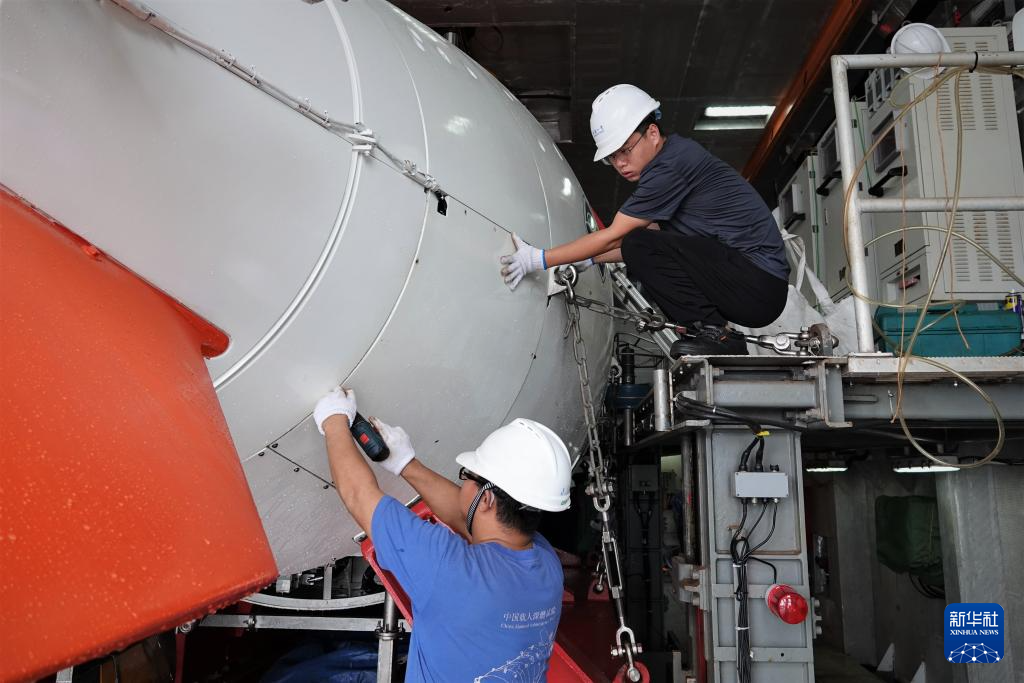 8月30日,“蛟龙号”运维保障工程师蒋盛(左)、修可顺拆卸“蛟龙号”外壳,对蓄电池进行维护。