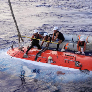 8月30日,“深海一号”船水手董玉泉、张迪、宋思亮、王萌萌(从左至右)进行挂缆作业,将完成下潜的“蛟龙号”回收至“深海一号”船甲板。