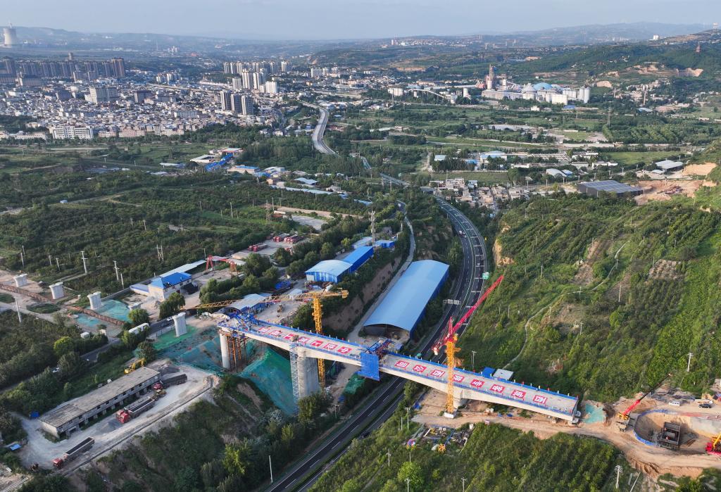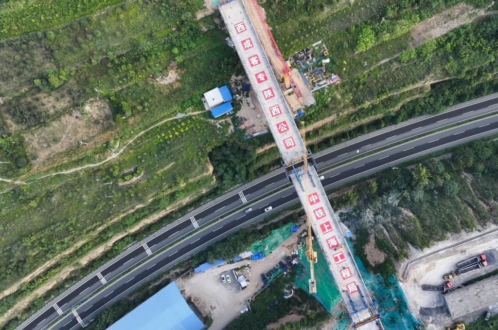 这是西延高铁铜川跨包茂高速公路特大桥施工现场(8月30日摄,无人机照片)。