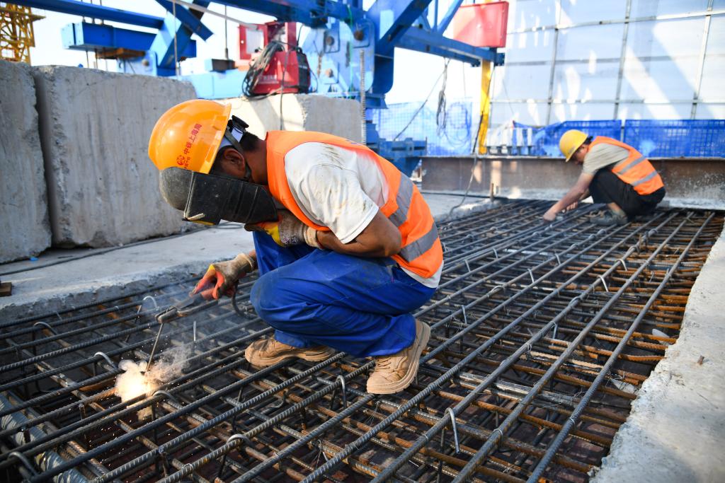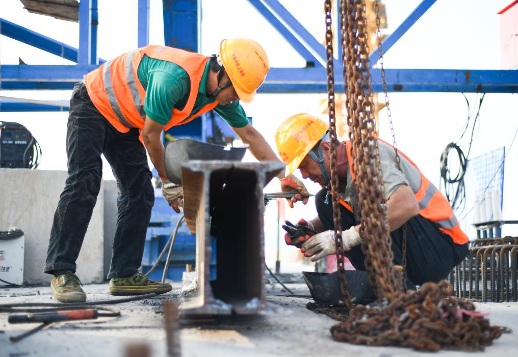8月30日,中铁上海工程局施工人员在西延高铁铜川跨包茂高速公路特大桥施工现场工作。