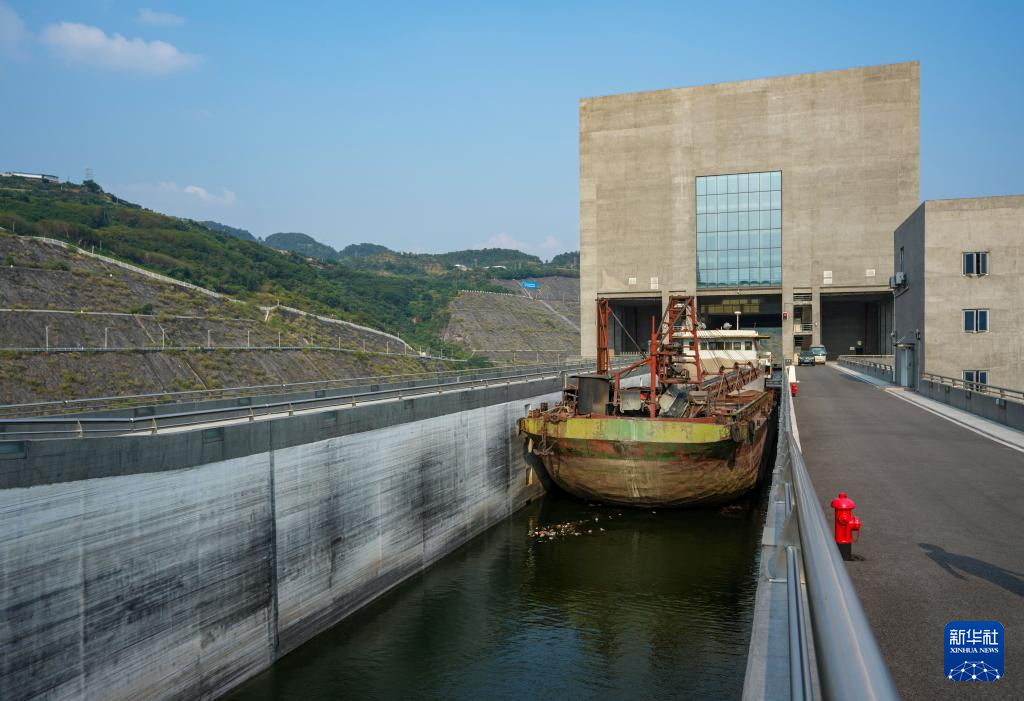 8月29日,一艘船通过向家坝水电站升船机到达坝顶。