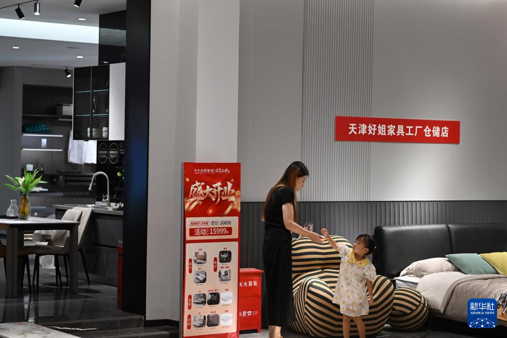 在天津市红桥区盖来普工业园,顾客带着孩子在家装馆内选购(8月30日摄)。