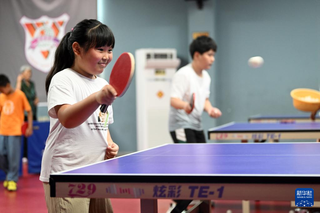 在天津市红桥区盖来普工业园,小朋友在乒乓球馆内打球(8月30日摄)。