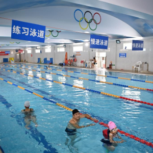 在天津市红桥区盖来普工业园,居民在游泳馆内游泳(8月30日摄)。