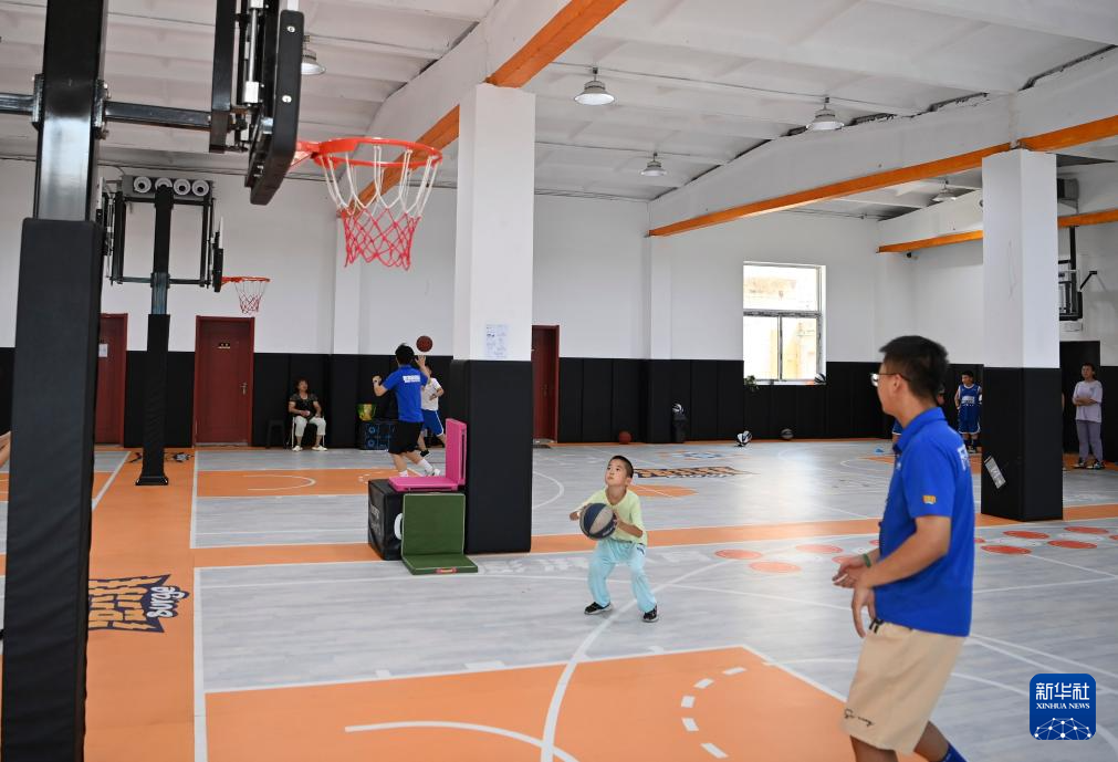 在天津市红桥区盖来普工业园,小朋友在篮球馆内练习(8月30日摄)。