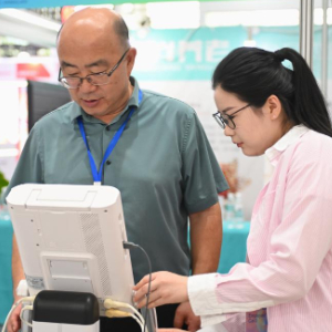 8月30日,工作人员在养老服务业博览会上为参观者义诊。