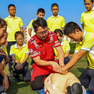 当日,在山东省荣成市第二实验中学,荣成市红十字会志愿者为学生们开展“开学第一课”应急救护技能培训活动,通过技能讲解和操作,让学生掌握基本急救方法,提高安全意识。