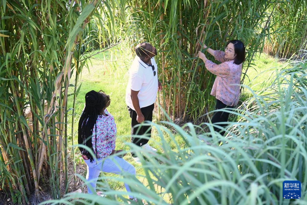 福建农林大学国际菌草工程技术研究中心副主任林冬梅(右)在福建农林大学国际菌草苑向马文博(中)、梅迪介绍菌草品种“绿洲一号”芦竹的生长情况(8月26日摄)。