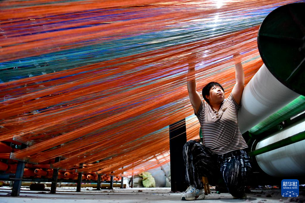 8月31日,在滨州市惠民县辛店镇一家地毯加工厂,工作人员在整理纺线。