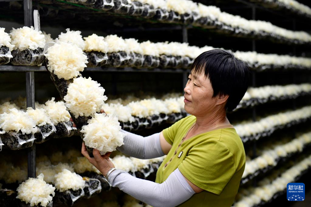 8月31日,在滨州市惠民县胡集镇银丰食用菌种植合作社,工作人员在查看银耳长势。