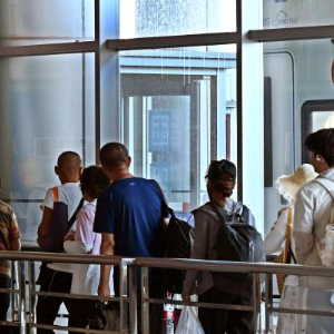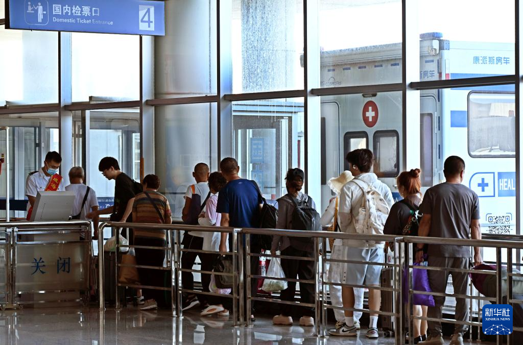 8月31日,旅客在山东港口威海港客运码头候船大厅排队验票。