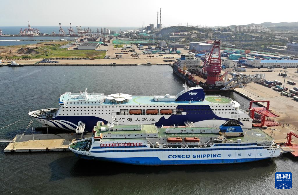 8月31日,两艘客滚船舶靠泊在山东港口威海港(无人机照片)。