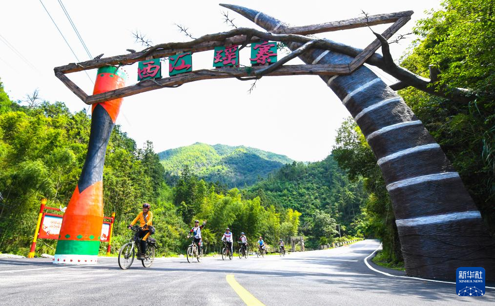 8月31日,游客在常宁市塔山瑶族乡西江村西江瑶寨民宿区骑行。