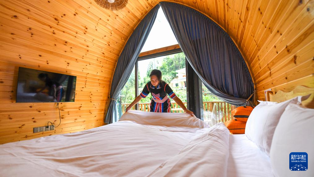 8月31日,常宁市塔山瑶族乡西江村一民宿工作人员在整理床铺。