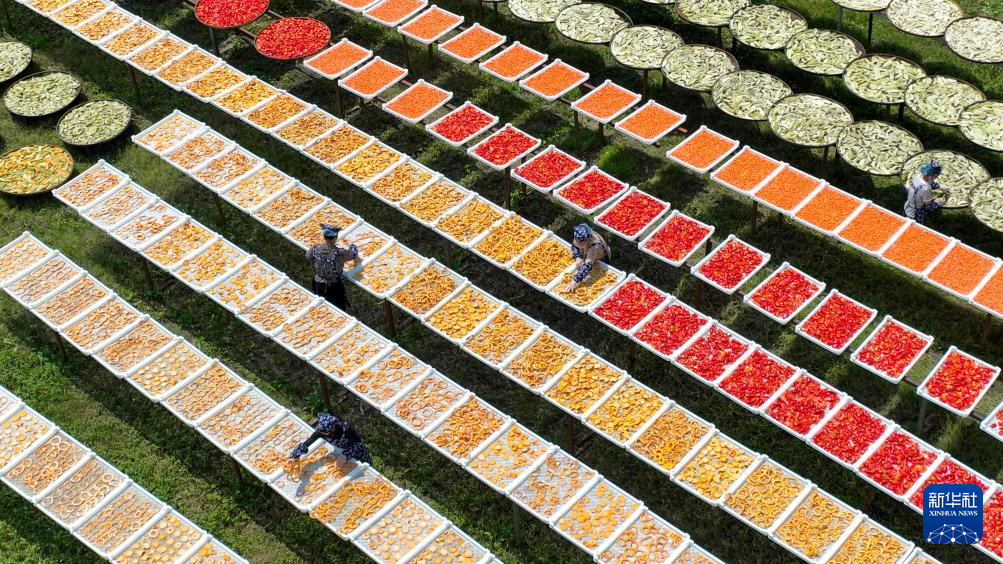 初秋时节,江西省宜春市铜鼓县乡村迎来丰收季节。南瓜、辣椒、苦瓜、笋干等农作物晾晒在农家房前屋后,与田园风光融为一体,呈现出五彩缤纷的丰收图景。