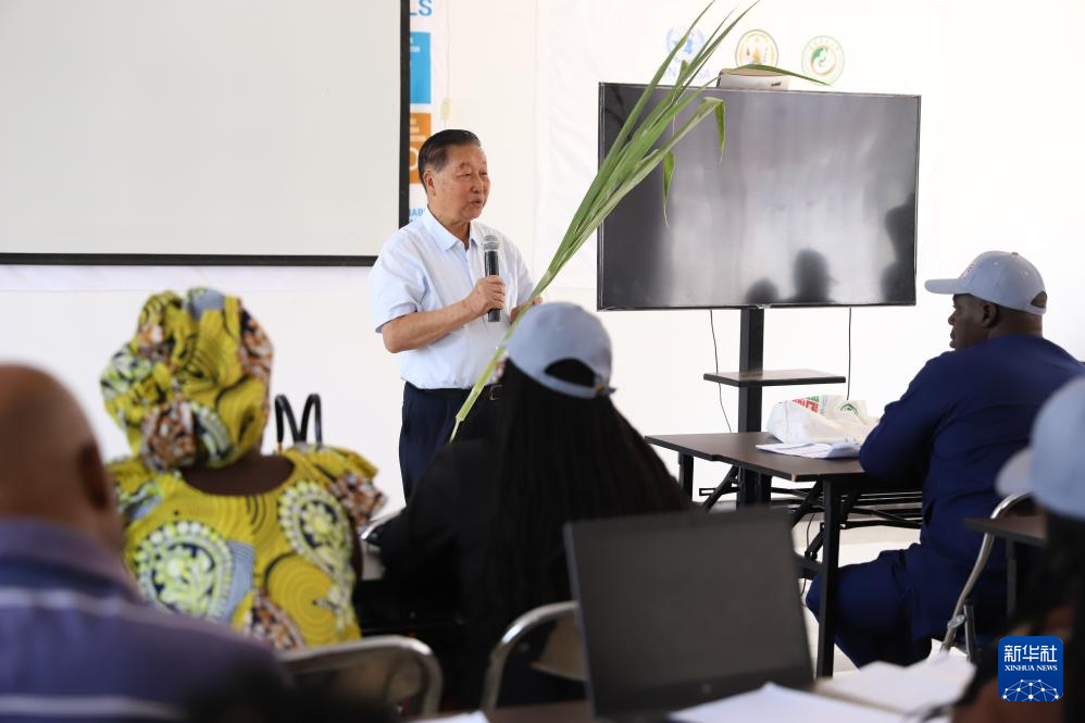 8月4日,在位于卢旺达南方省胡耶区的中国援卢农业技术示范中心的教室,菌草发明人林占熺为培训班学员讲解菌草技术。