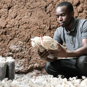 8月14日,在卢旺达南方省穆汉加区,尼扬博·奥贝德在食用菌培育工坊内检查菌袋。曾两次赴中国进行菌草技术培训的尼扬博·奥贝德在南方省和东方省各拥有一家工坊。