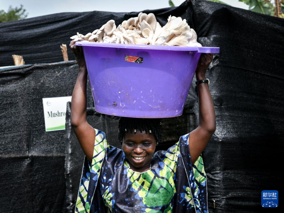 2月6日,在中非共和国达马拉,法蒂玛在菇棚内收获菌草菇。2022年,法蒂玛在听说中国菌草专家在班吉传授技术后主动前往学习,从一间小菌棚起步,逐渐扩大为如今小有名气的合作社。