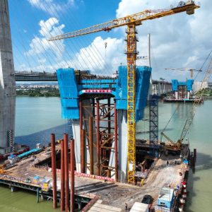 当日,中铁建大桥局承建的深江铁路关键性工程跨磨刀门水道主桥东主墩下横梁浇筑完成。该桥横跨中山和江门两市交界的西江磨刀门水道,主桥为140米高墩大跨斜拉桥,采用智能造塔机施工。