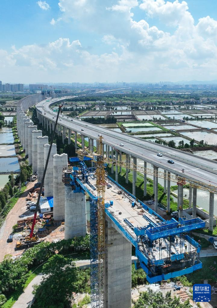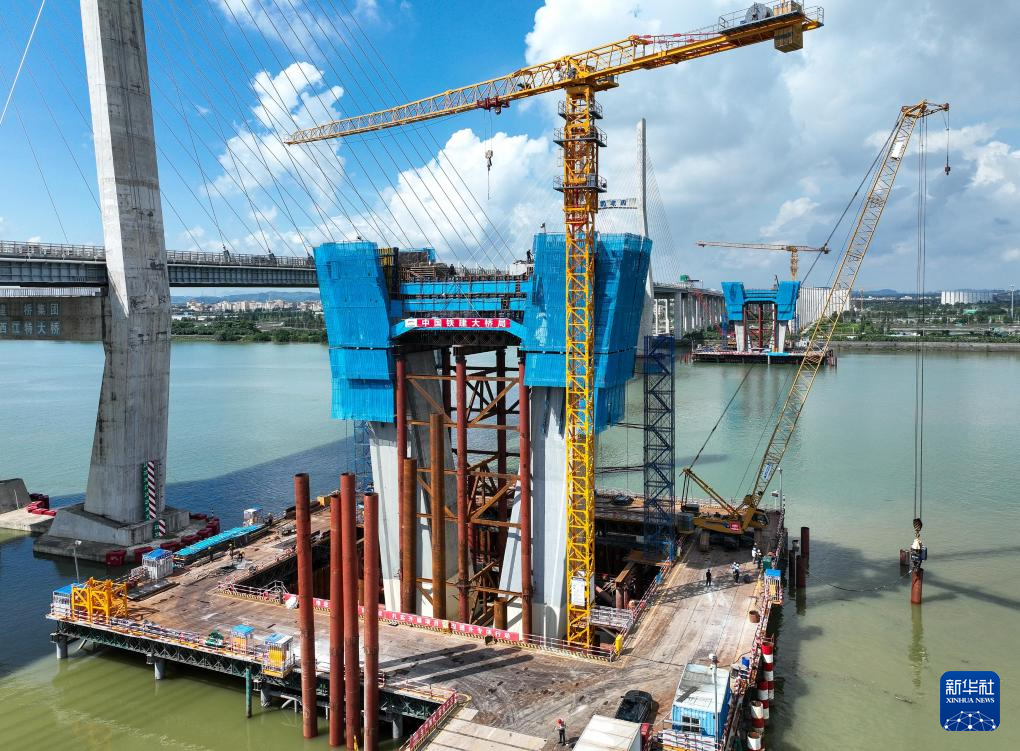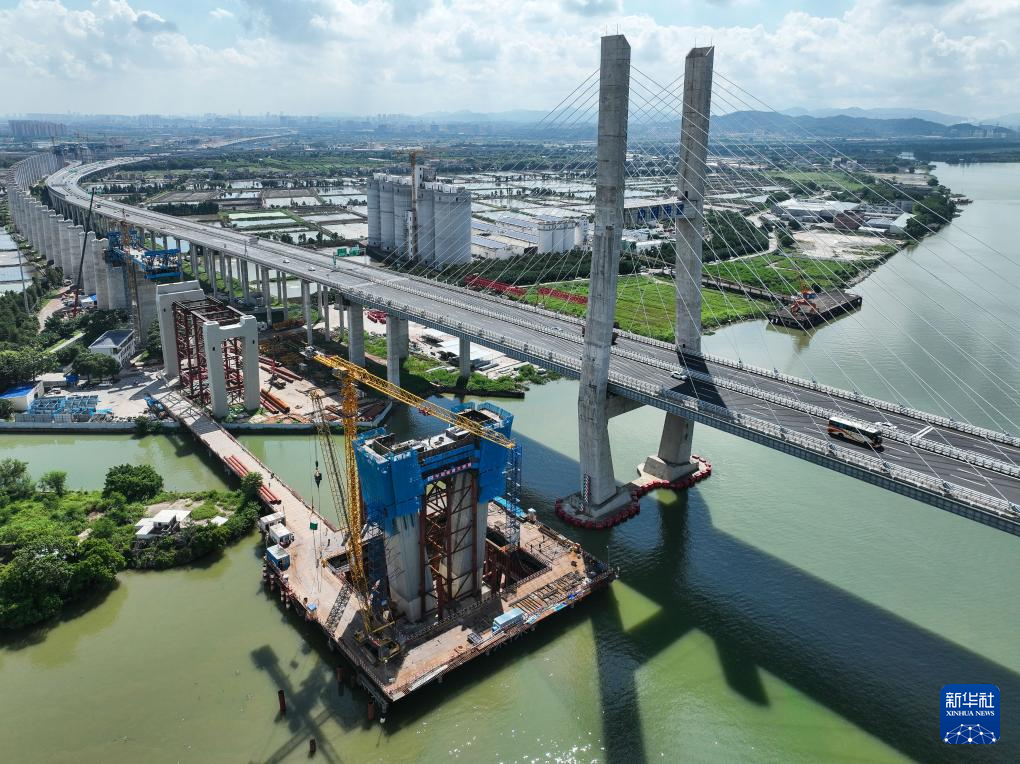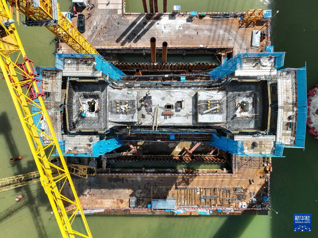 9月1日,深江铁路跨磨刀门水道主桥东主墩(左下)下横梁浇筑完成(无人机照片)。