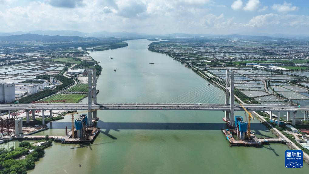 深江铁路跨磨刀门水道主桥横跨中山和江门两市(9月1日摄,无人机照片)。