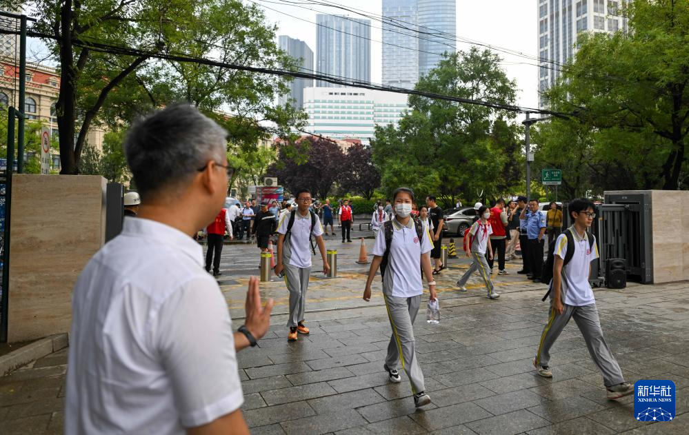 9月1日,天津一中学生走进校园与教师打招呼。