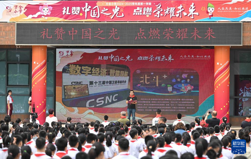 9月1日,在天津市和平区万全小学,南开大学教授李国强为学生们普及科学知识,寄语学生。