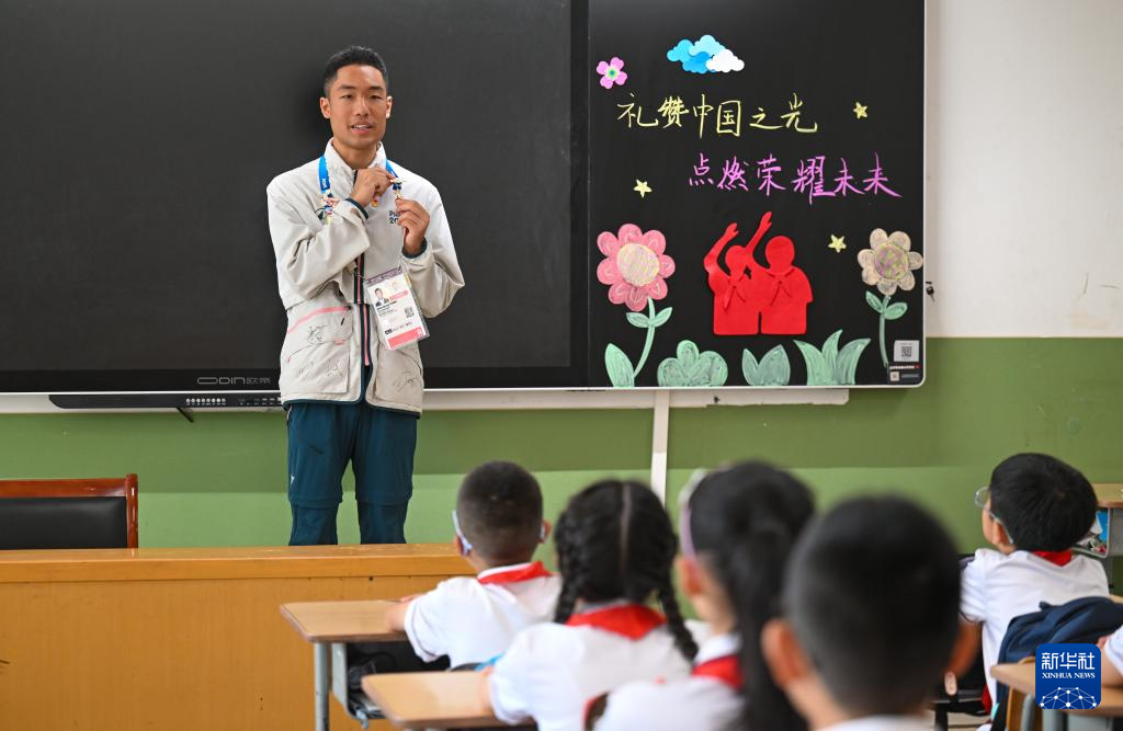 9月1日,在天津市和平区万全小学,来自天津师范大学的巴黎奥运会志愿者陈文栋为学生们讲述志愿服务故事。