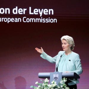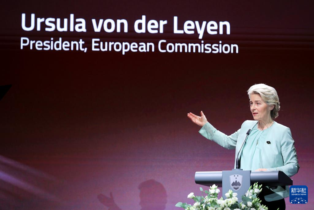 9月2日,欧盟委员会主席冯德莱恩在斯洛文尼亚布莱德举行的布莱德战略论坛上讲话。